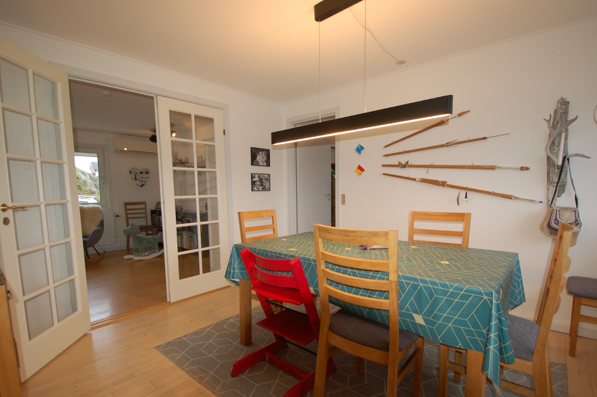 Fra køkkenet er der udgang til en stor sydvestvendt terrasse, hvor man kan nyde den flotte udsigt over fjorden og havneindsejlingen.